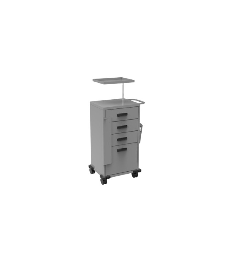 Carro de em pintura epóxi com 3 gavetas, sendo a 1ª gaveta com divisórias para medicamentos e a 2ª e a 3ª gaveta para uso geral. Possui na região inferior compartimento para uso geral com porta basculante, e na região superior mesa para preparação de medicamentos. Acompanha tábua para massagem cardíaca e bandeja de apoio.