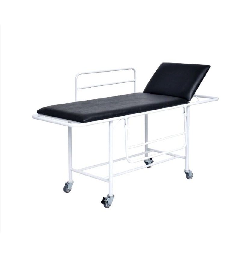 Maca Padiola (leito fixo) com cabeceira regulável e par de grades laterais. Estrutura em pintura epóxi com rodízios e dois freios em diagonal.