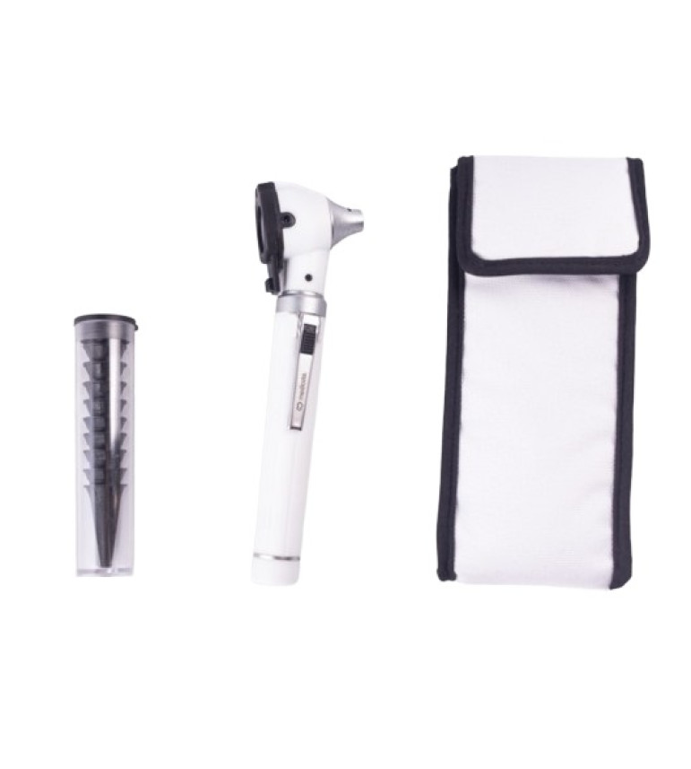 Embalagem: 01 Otoscópio Branco, 01 Esojo branco e 10 espéculos esterilizáveis de plastico com diâmetros de 2,5 mm e 4mm.