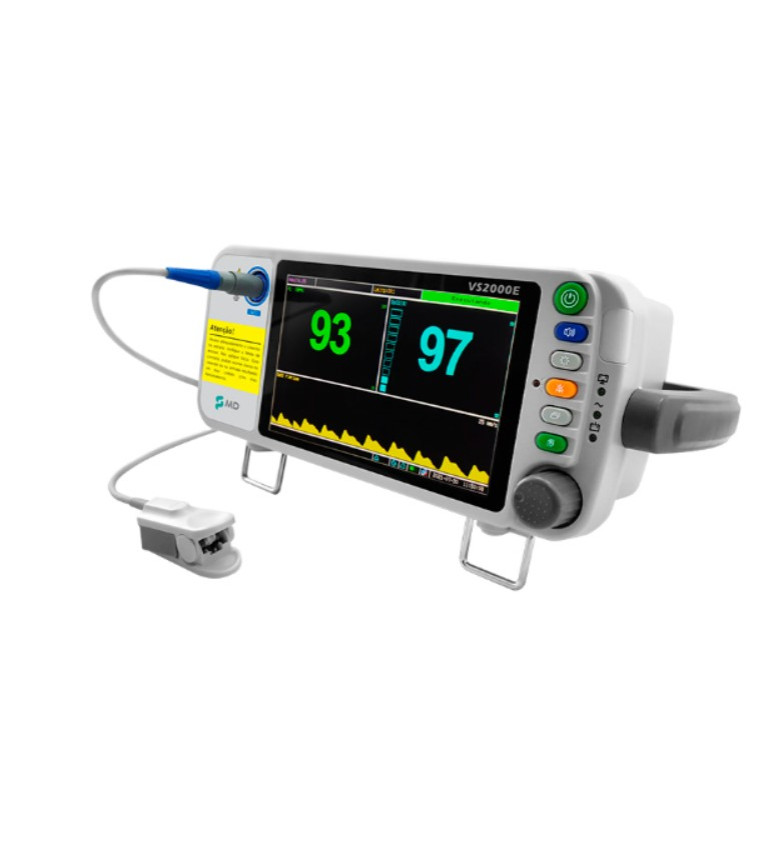 O VS2000E é um equipamento para monitoramento contínuo da saturação de oxigênio, frequência cardíaca e força de pulso.